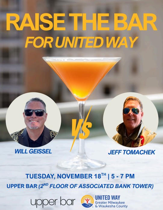 Come One, Come All! This will be another fantastic battle behind the bar in "Raise The Bar For United Way". Will Geissel and Jeff Tomachek will be your honorary mixologists for the evening whipping up some crafty cocktails, pouring wine, and spilling beer for colleagues, friends, and family to benefit the United Way, on Tuesday, November 18th, from 5 pm to 7 pm in the Upper Bar on the 2nd Floor of the associated bank tower where 10% of all bar revenues, 100% of tips, and 100% of the on-line donations will be donated to Uinted Way. Click on the photos below to make a donation into their tip jar if you’re unable to attend the event on November 18th